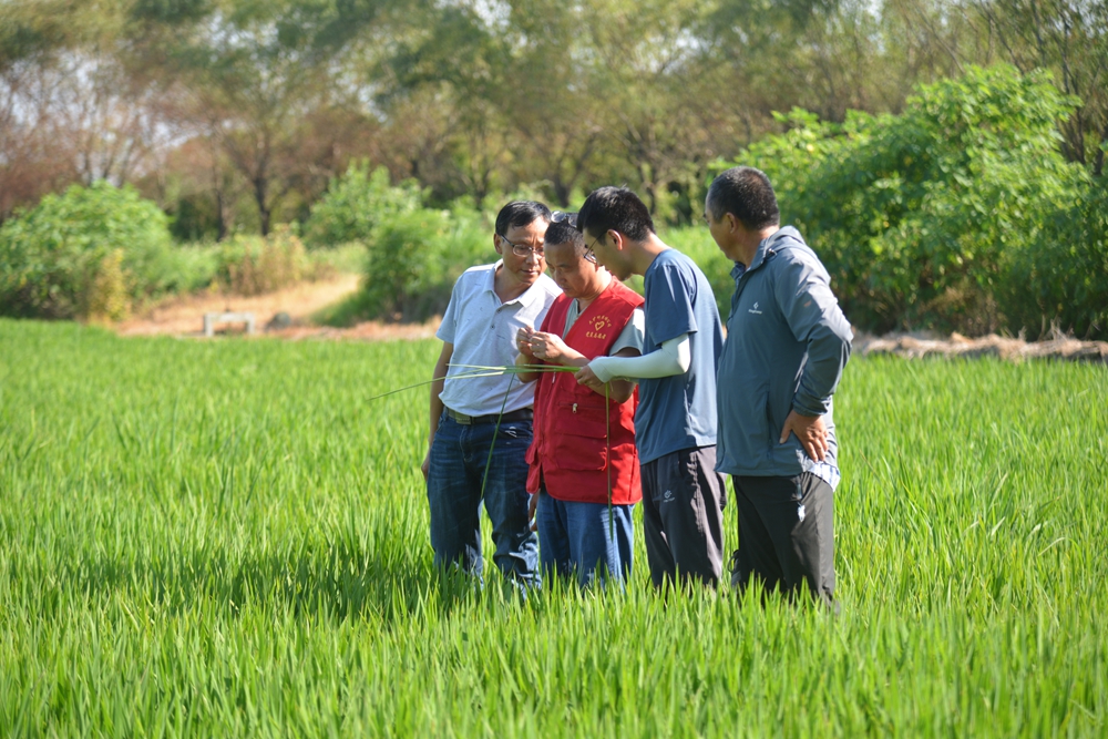淮南农场公司管理人员和农技人员调查水稻叶龄、茎蘖数和病虫害发生情况。(王慧 摄)