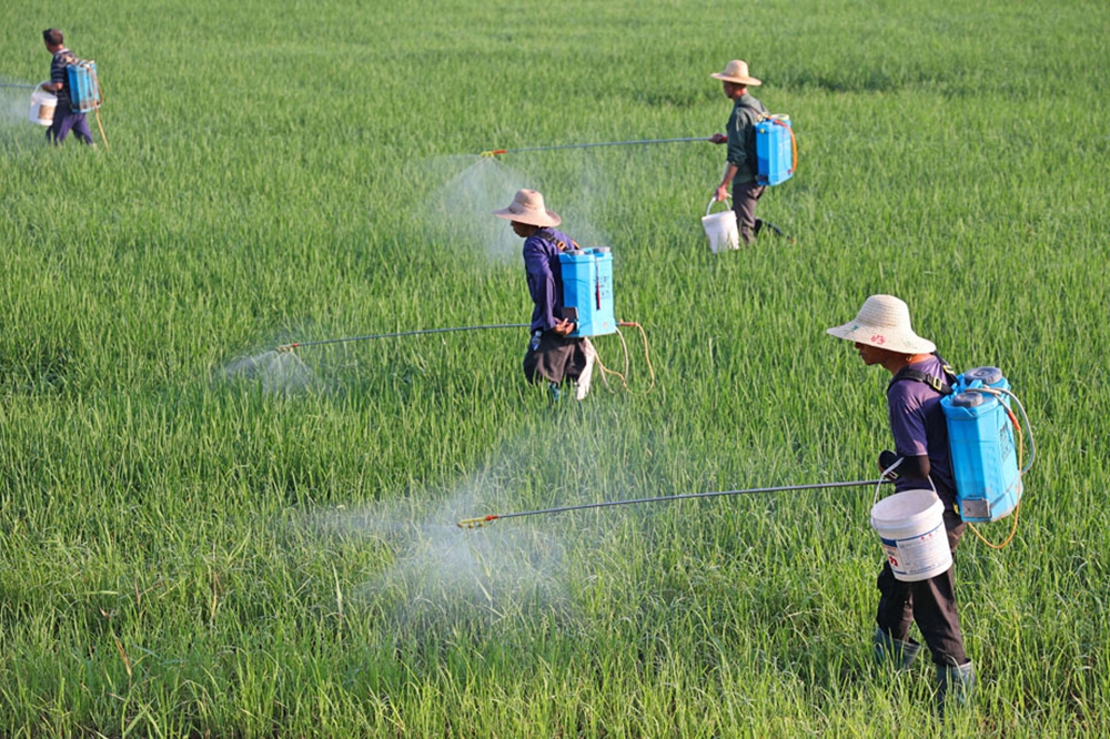 8月7日,华阳河农场公司第二农业分场水稻田里,种植户正在进行稻田喷药施肥作业。(李龙 摄)