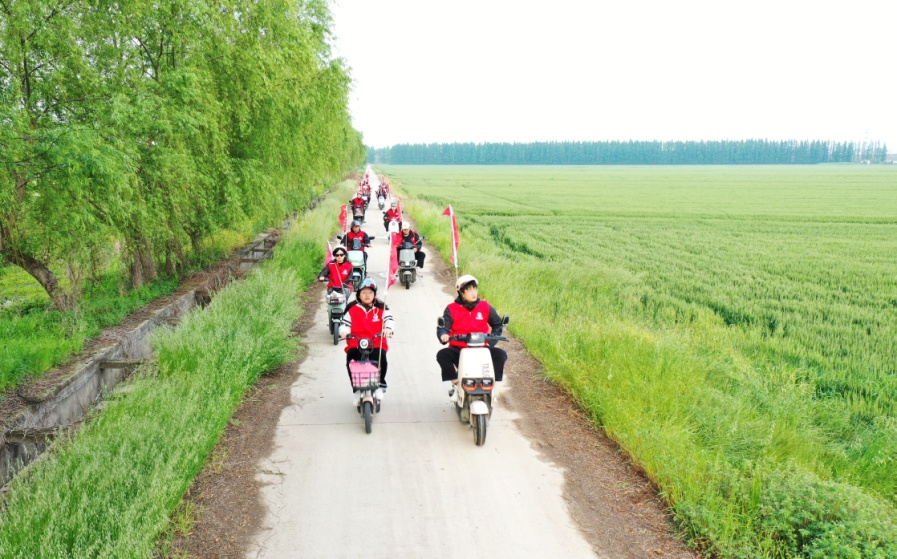 接下来,30名身着红色马甲的青年员工整装出发,车身飘扬着读书会旗帜,车篮里装满《全民读书倡议书》。骑行队伍穿梭在职工小区、麦田旁的杉树林,最终抵达第三农业生产管理区田间。一路上,大家向沿途职工群众递上倡议书,分享读书日意义,倡导全民阅读新风尚。(董 云)
