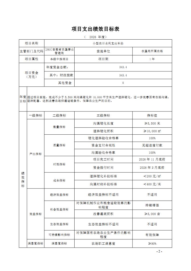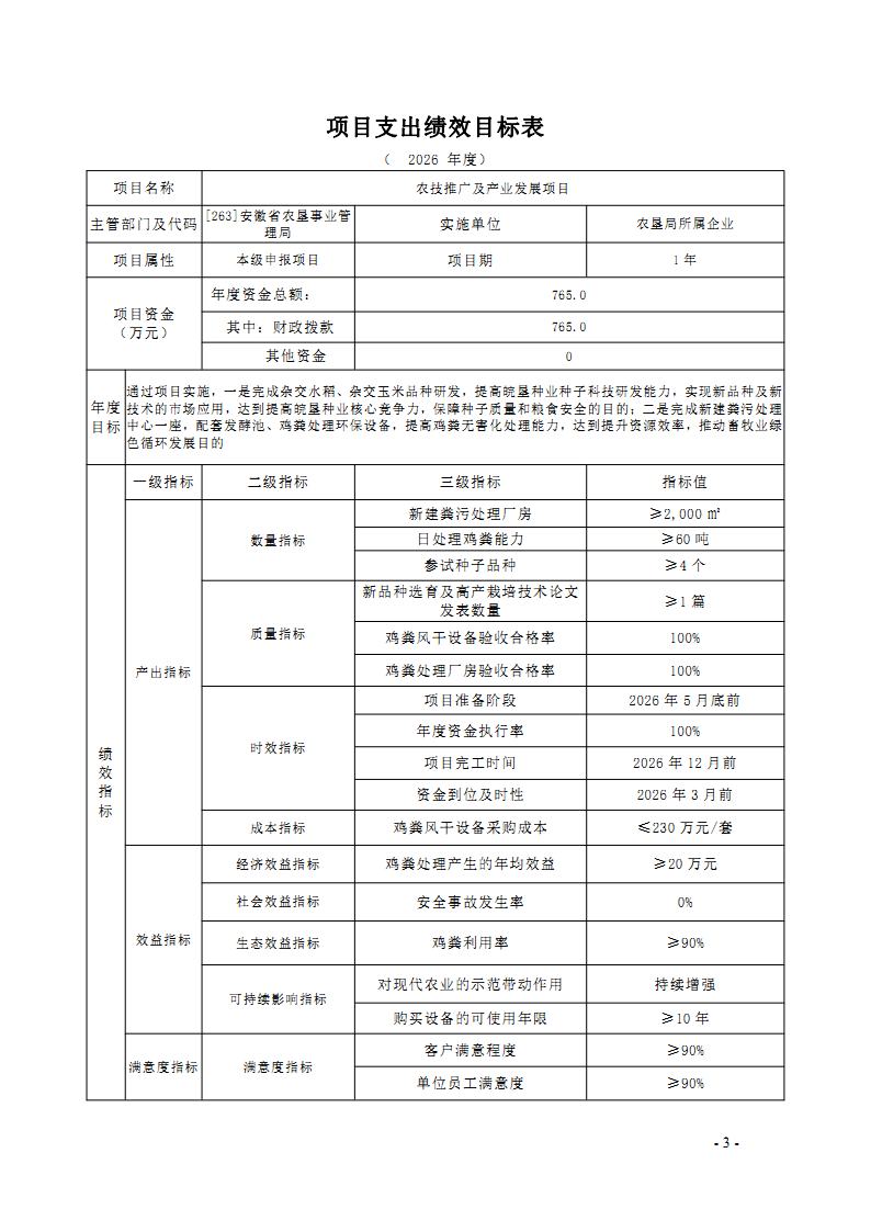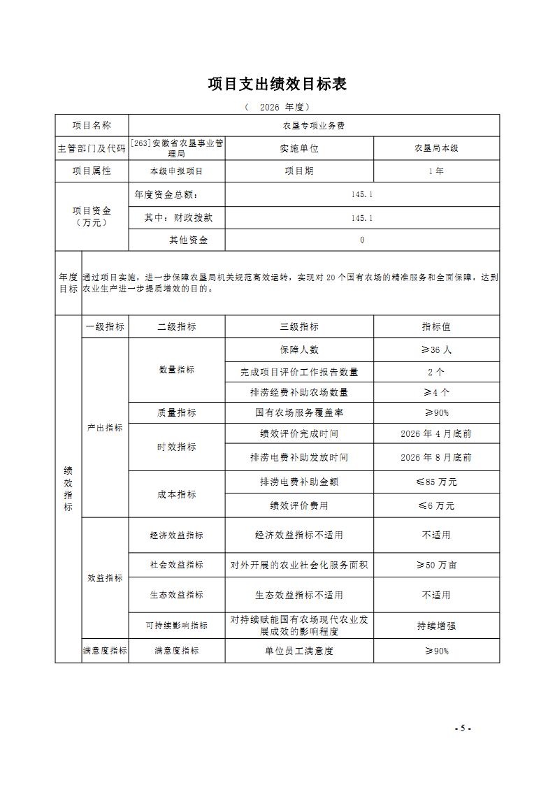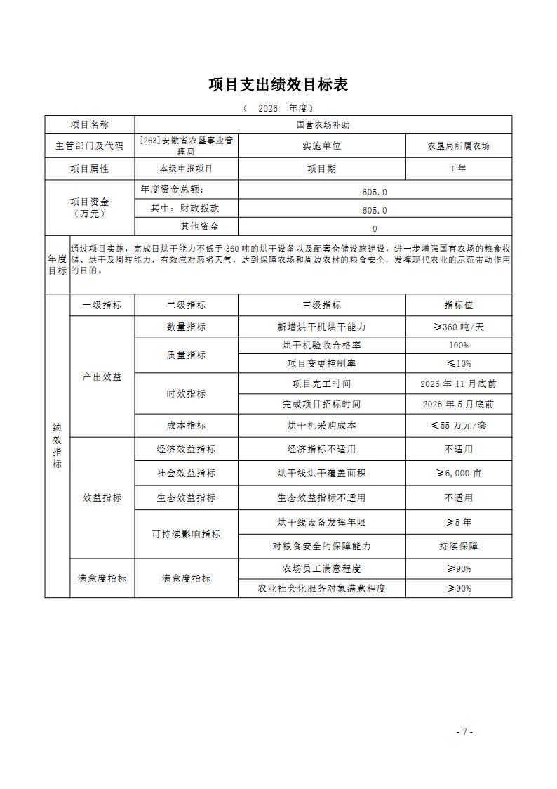 安徽省农垦事业管理局2026年部门预算批复的其他项目绩效目标